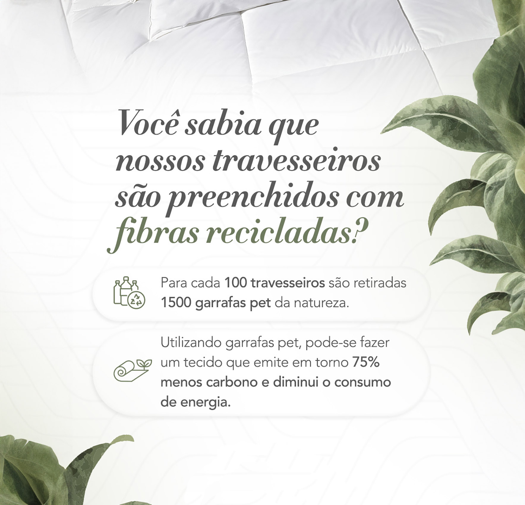 Uma boa noite de descanso precisa de um bom travesseiro. Com o Oasis, seus hóspedes irão repousar sentindo a maciez do percal 200 fios. Confeccionado em 50% algodão e 50% poliéster. Você sabia? Cada um dos nossos travesseiros é um passo em direção à sustentabilidade! Com fibras recicladas de garrafas PET, cada lote de 100 travesseiros ajuda a retirar cerca de 1.500 garrafas do meio ambiente.